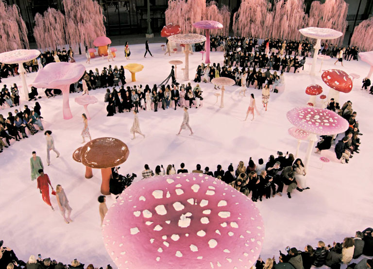 Popular French fashion house Chanel designed a unique runway for its Spring Summer 2026 haute couture show. The runway was circular and was created at the Grand Palais in France. It featured red, pink and yellow mushroom-shaped structures that created a fantasy-like ambience. The runway space was bordered by actual willow trees that were given a pink hue, blending a nature-inspired setting with fashion. The setting also included curved seating for guests.