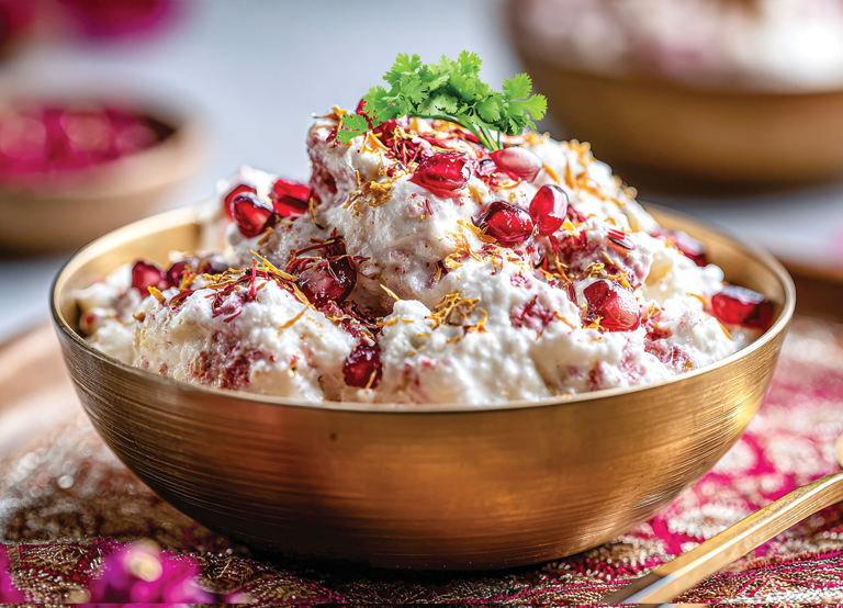- Top with fresh coriander and pomegranate seeds.