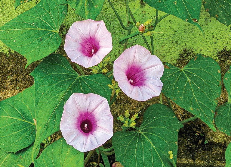 - The plant produces trumpet-shaped flowers, similar to morning glory flowers.