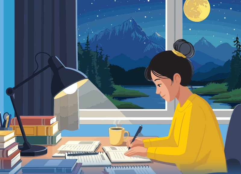 I always write in the night—either because I prefer napping in the day, or simply owing to the fact that my dark, melancholy self finds the single ray of moonlight surreptitiously sneaking into my bedroom window and creeping onto my desk more inspirational than the sunlit dawn echoing with the dulcet tones of morning birds. The latter background I prefer when it comes to getting lost in the land of dreams.