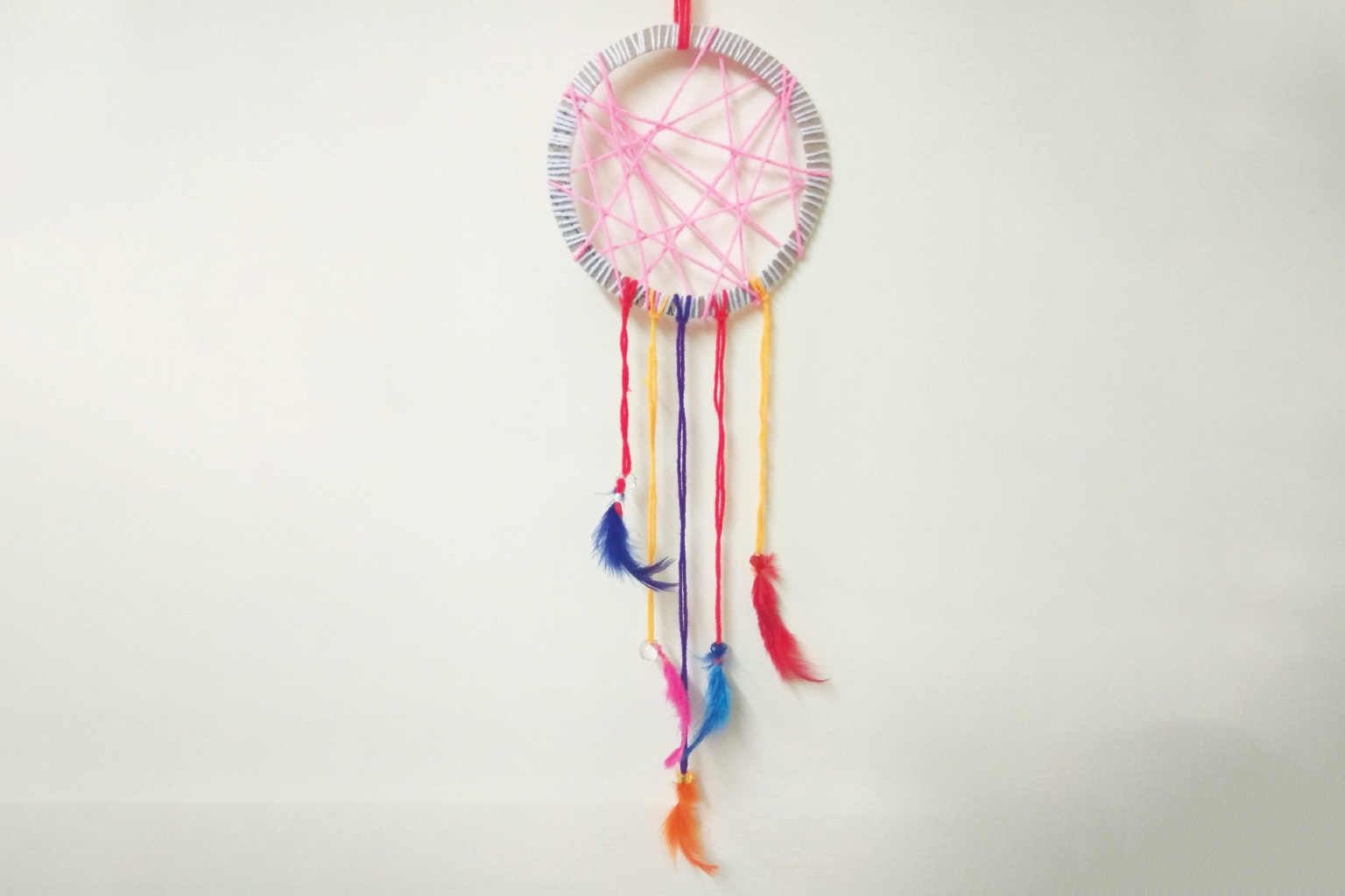- Hang colourful strands of wool on 1 end of the circle as shown.