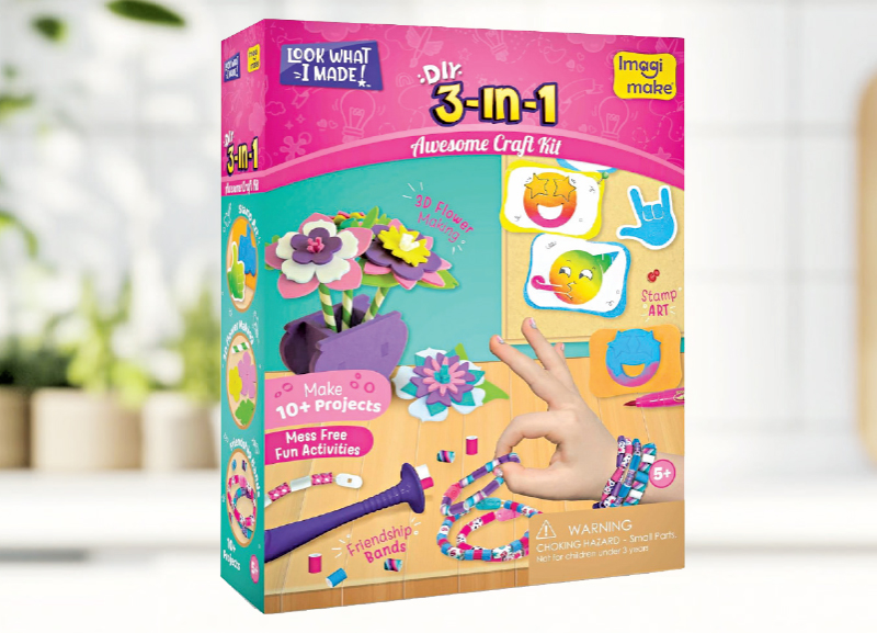 This creativity kit can be used to make handmade gifts. The kit includes materials for creating stamp art, 3D foam flowers and friendship bands.