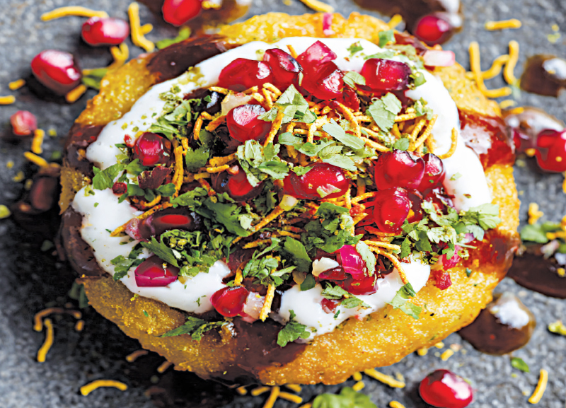 - Place 4 tikkis on a plate and top them with the sweetened curd, tamarind chutney, cucumber, pomegranate pearls, grapes and peanuts.
