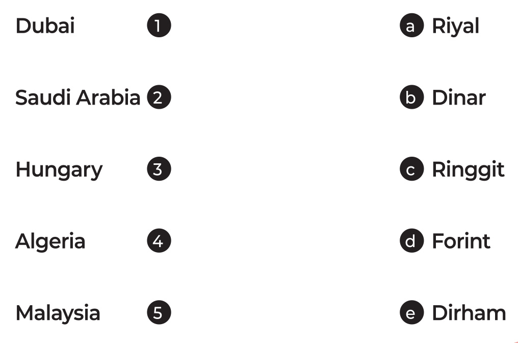 Match the countries to the correct currency.