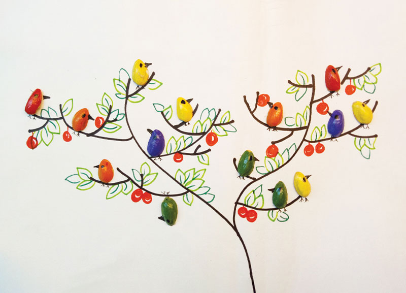 - Decorate the tree by drawing leaves and fruits on it. Your pistachio bird painting is ready.