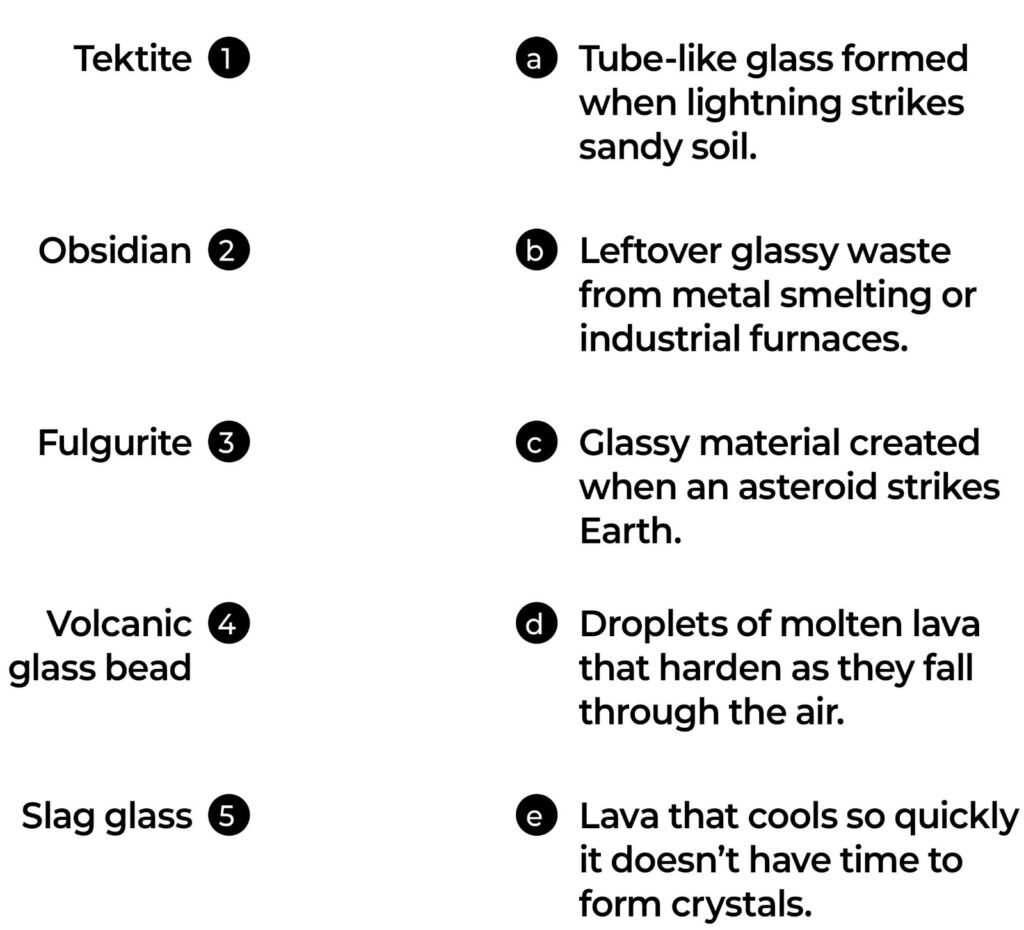 Tektites are glassy materials that form naturally due to asteroid impacts. Tektites of different sizes and colours, including black and green, exist.