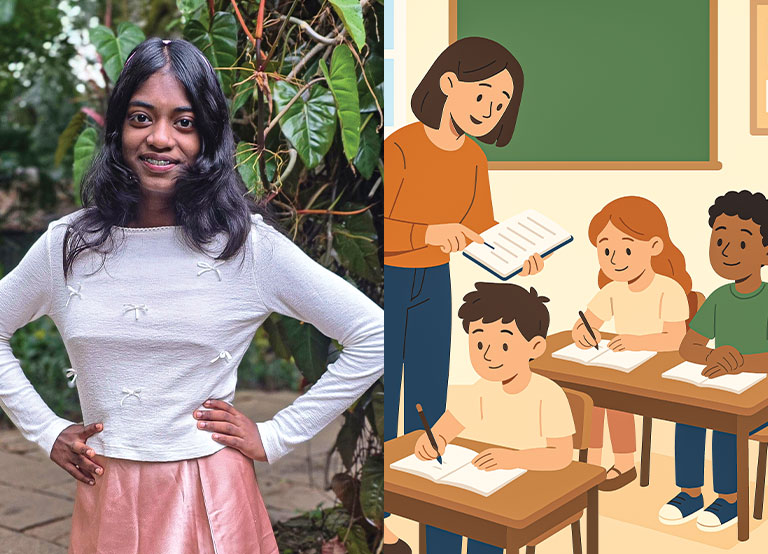 My class teacher, Preetha Akka, is my inspiration. She is loving, patient and very approachable. She is also creative and can turn the most boring lessons into fun experiences. She treats every student equally and makes everyone feel special. She teaches us English and whenever I share my pieces of writing with her, she provides me with valuable tips to improve my skills. Whenever we face difficulties, we approach her without hesitation. She is more like a friend than a teacher to us.