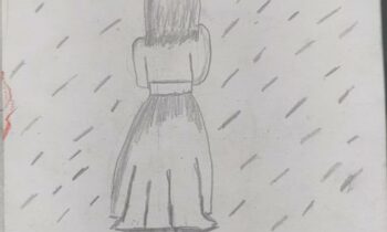• Draw a face, hair and body around the eyes as shown.