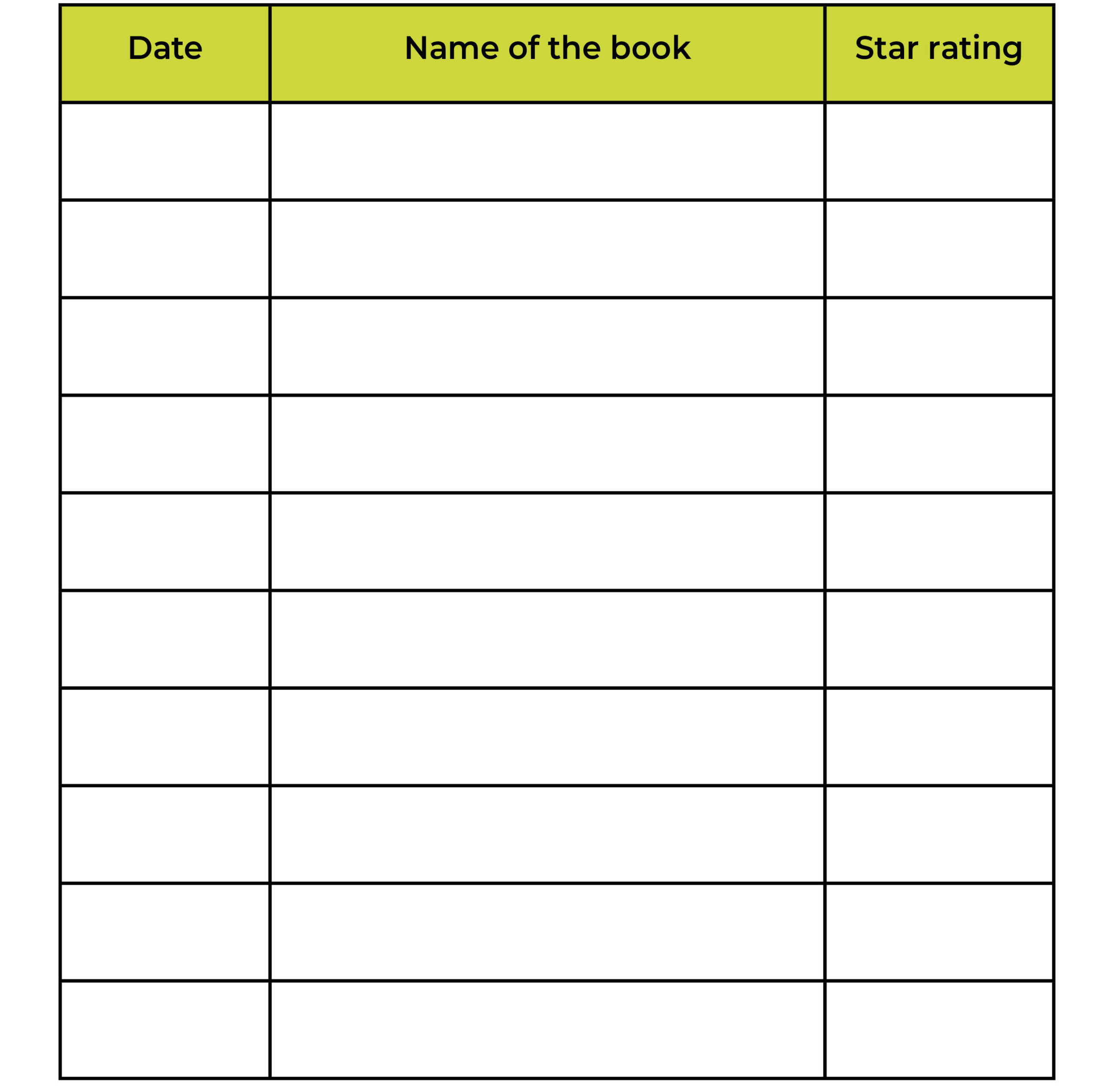 What to do: We have created a 10-book grid for you. As soon as you finish a book, write the date and the bookʼs title and give it a star rating.